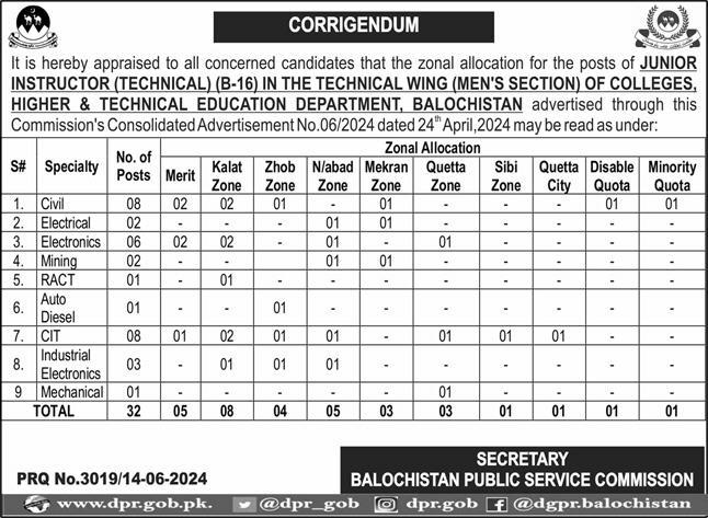 BPSC Balochistan Public Service Commission jobs advertisement dated about 15 June 2024 in daily Express Newspaper invites application for the vacant post of instructor electronics, instructor technical, instructor industrial electronics, instructor cit, instructor electrical, instructor, instructor civil, instructor mechanical, instructor auto diesel, instructor ract and instructor mining in Quetta, quetta Balochistan Pakistan. Preferred Education is BA, Bachelor and B.E etc.
