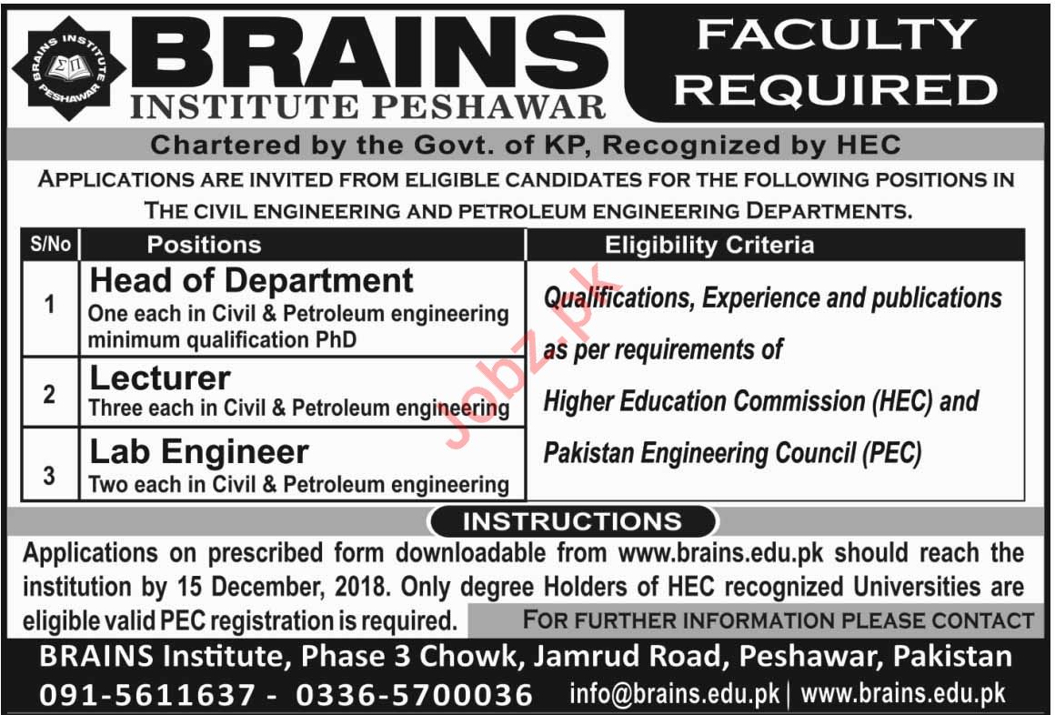 Brains Institute Peshawar KPK Jobs 2018
