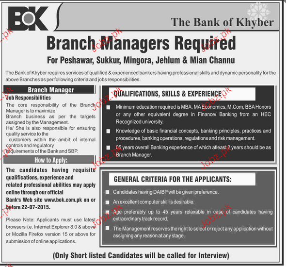 Branch Manager Job In The Bank Of Khyber