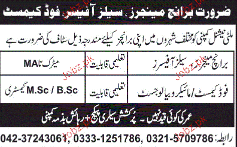 Branch Manager, Sales Offiecrs And Food Chemist Wanted