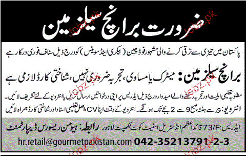 Branch salesman are required in Lahore.