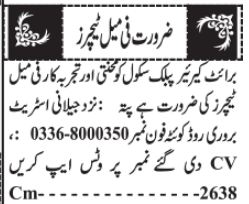 Vacant posts including Female Teacher, English Teacher, Math Teacher, Urdu ateacher, Science Teacher, Teacher and Computer Teacher are announced in Bright Career Public School Quetta Balochistan Pakistan as per 15 February 2022 advertisement in daily Jang Newspaper. Persons with Master and Bachelor etc. education can apply.