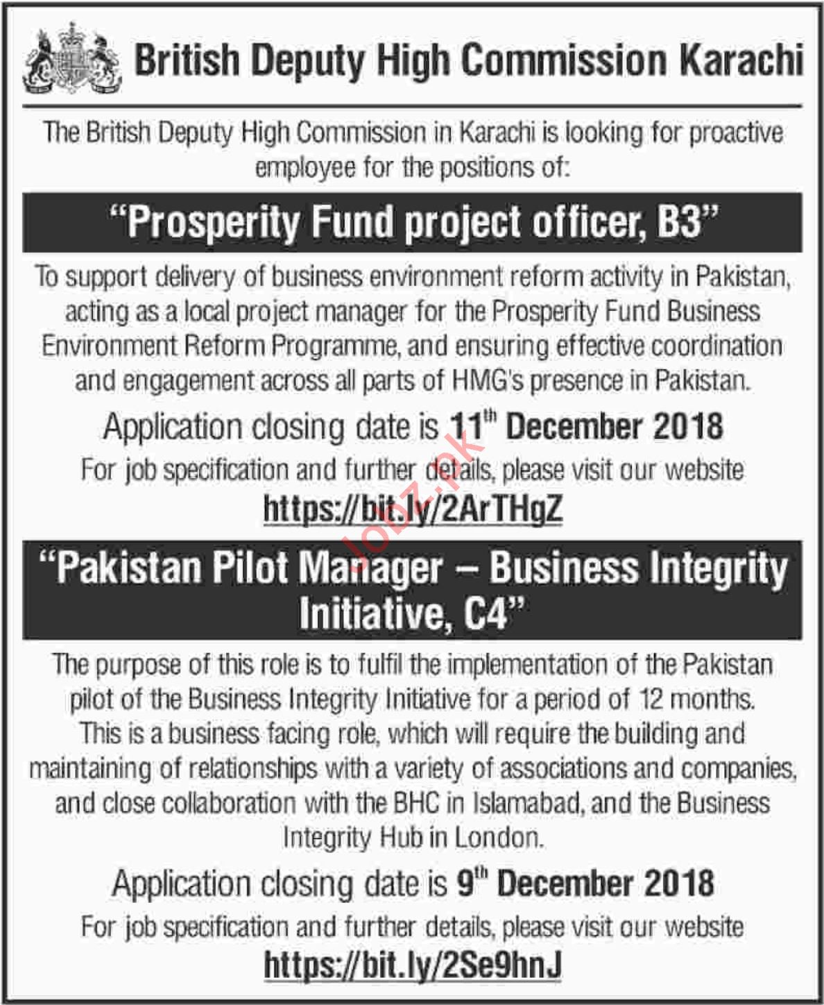 Vacancies in British Deputy High Commission Advertisement December 2018