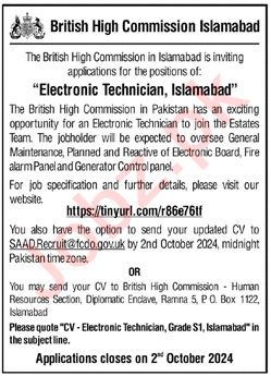 British High Commission Islamabad Islamabad, islamabad Islamabad Pakistan invites applications from eligible candidates for the post of electronic technician as per advertisement of September 22, 2024 published in daily Jang Newspaper. Candidates with Intermediate and Matric etc. educational background will be preferred.