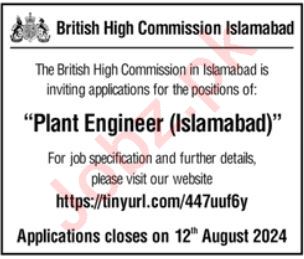 British High Commission Islamabad Islamabad, islamabad Islamabad Pakistan invites applications from eligible candidates for the post of plant engineer as per advertisement of August 4, 2024 published in daily Jang Newspaper. Preferred Education is Bachelor and Intermediate etc.