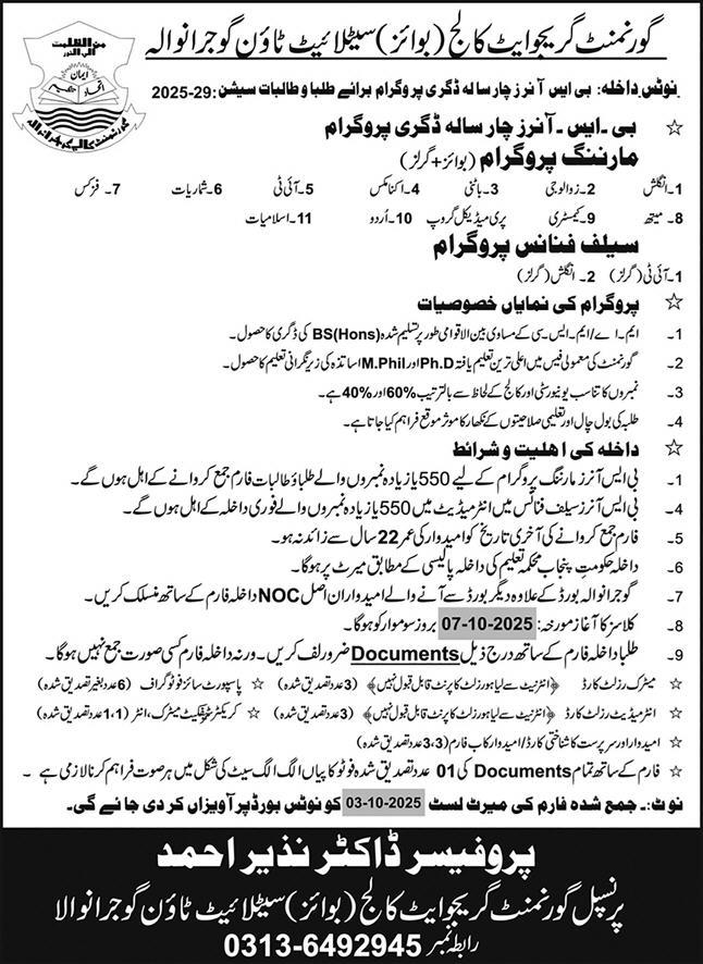 Government Graduate College admissions 2025 for bs has been announced. Students can enroll for admissions in Government Graduate College Gujranwala Punjab Pakistan for academic year 2025 to continue campus based or online education in Science College. Students who want to enroll for academic session 2025 in qualification and admission criteria for Government institute can apply till last date. Read newspaper ad for exact details.