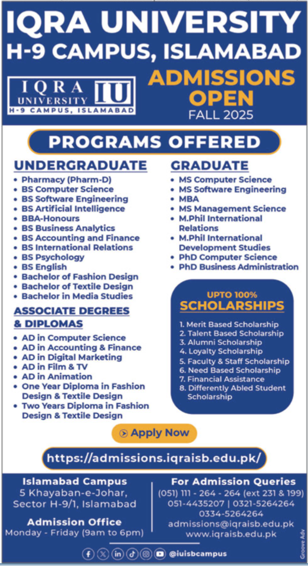 Iqra University Islamabad bs admissions 2025 has been started. Iqra University Islamabad Islamabad Islamabad Pakistan welcomes students to apply for admissions in academic year 2025 in Science University. Eligible students for fulfilling criteria for admissions in can enroll as per Government admission policy 2025 till closing date. Read newspaper ad for exact details.