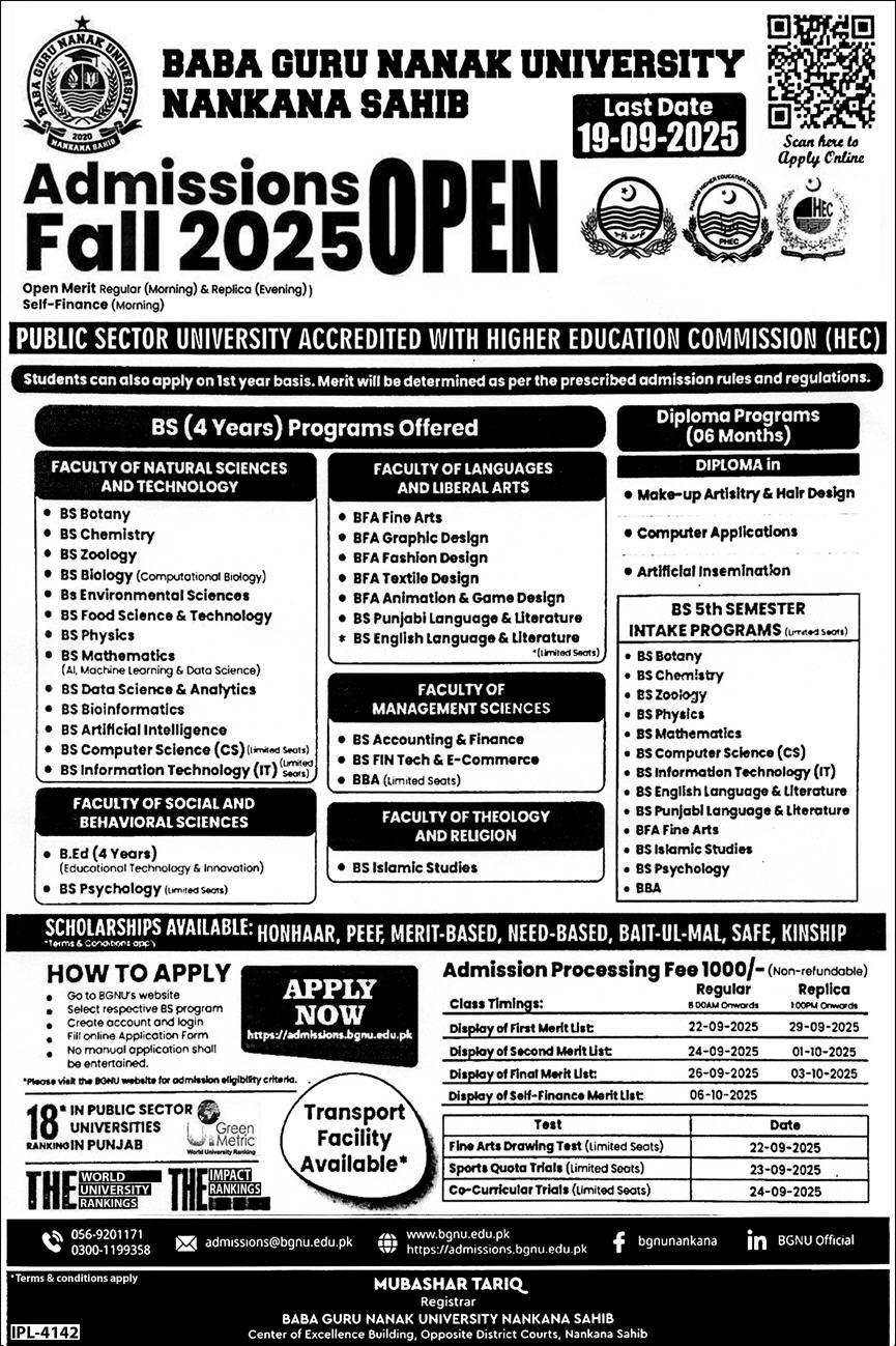 Baba Guru Nanak University has announced admissions 2025 for bs. Students who want to take admissions in Baba Guru Nanak University North Waziristan Khyber Pakhtunkhwa KPK Pakistan for academic year 2025 to continue education in Science University can apply. Students who want to enroll for academic session 2025 in qualification and admission criteria for Government institute can apply till last date. Read newspaper ad for exact details.
