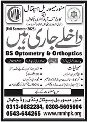 Munawar Memorial Hospital has announced admissions 2025 for bs. Eligible students can apply for academic admissions 2025 in Munawar Memorial Hospital Rawalpindi Punjab Pakistan for Science College. Eligible students for fulfilling criteria for admissions in can enroll as per Government admission policy 2025 till closing date. Read newspaper ad for exact details.