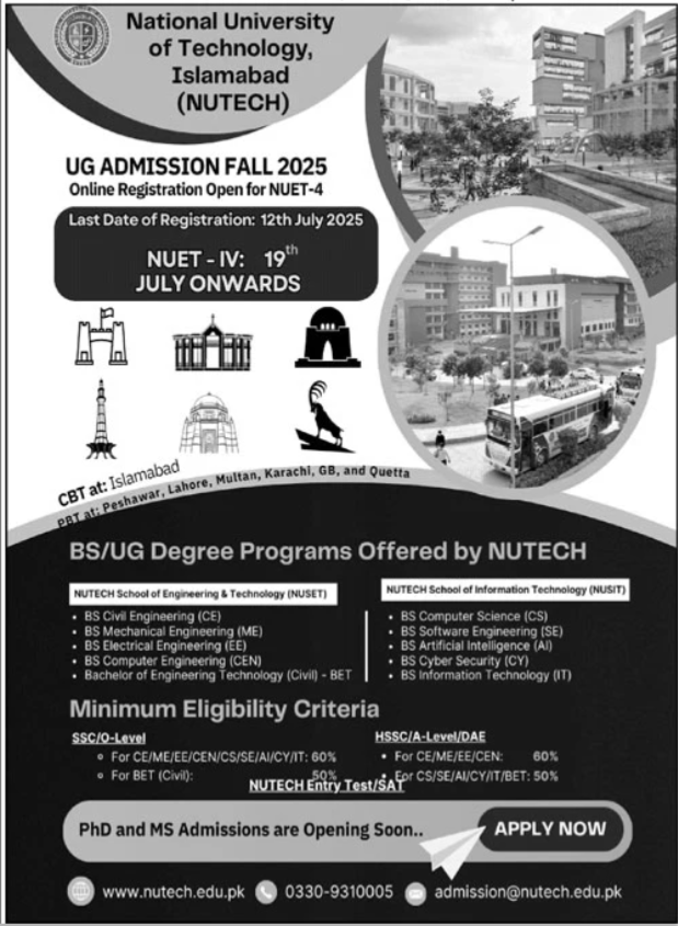 Admissions in National University of Technology NUTECH 2025 for BS has been announced. National University of Technology NUTECH Islamabad Islamabad Pakistan welcomes students to apply for admissions in academic year 2025 in Business University. Eligible candidates for admissions in can apply as per Government institute criteria and before closing date after reading advertisement online. Read newspaper ad for exact details.