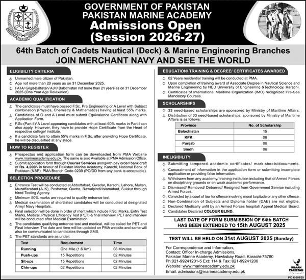 Admissions in Pakistan Marine Academy 2025 for bs has been announced. Students who want to take admissions in Pakistan Marine Academy Karachi Sindh Pakistan for academic year 2025 to continue education in Science College can apply. Eligible candidates for admissions in can apply as per Government institute criteria and before closing date after reading advertisement online. Read newspaper ad for exact details.