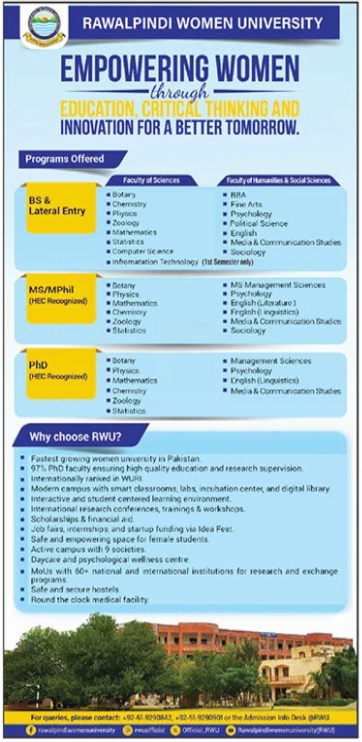 Rawalpindi Medical University RMU BS admissions 2025 has been started. Students can enroll for admissions in Rawalpindi Medical University RMU Rawalpindi Punjab Pakistan for academic year 2025 to continue campus based or online education in Science University. Eligible students for fulfilling criteria for admissions in can enroll as per Government admission policy 2025 till closing date 25 September 2025. Read newspaper ad for exact details.
