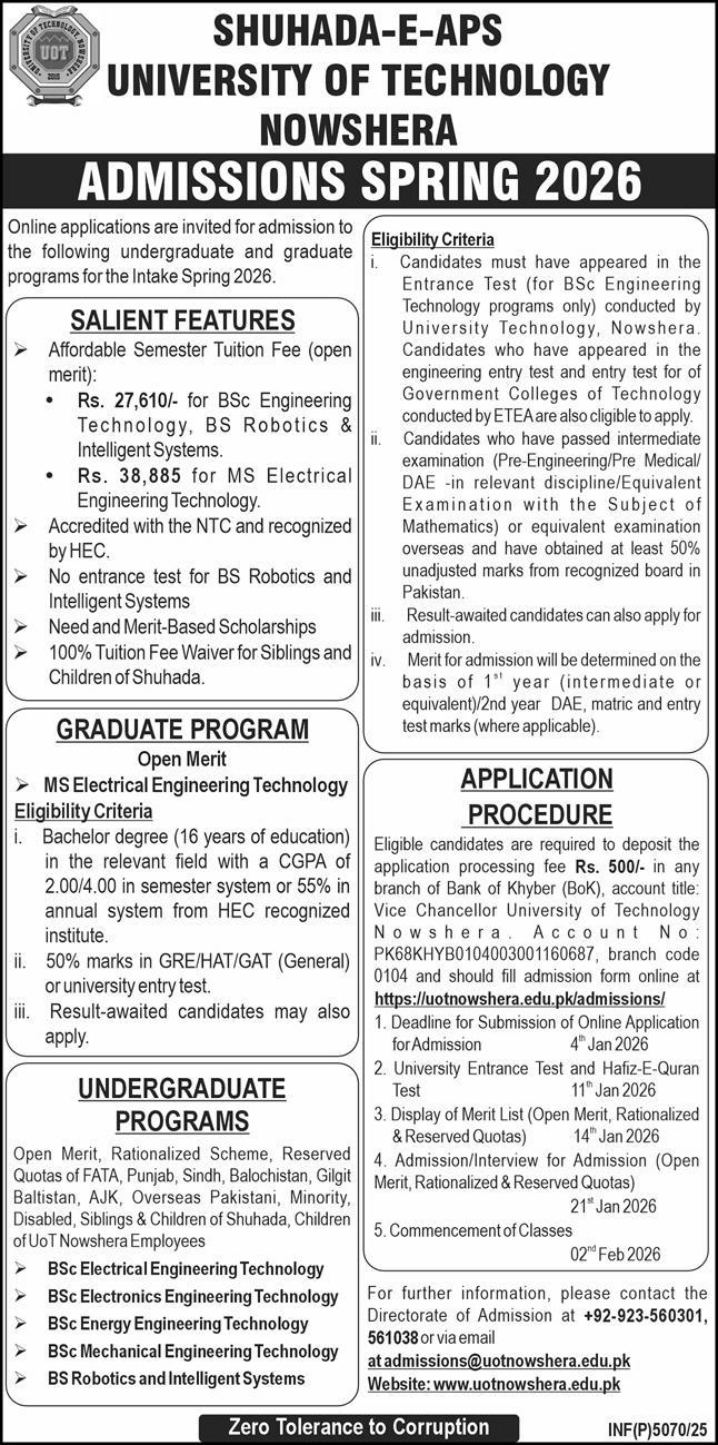 University of Engineering and Technology UET has announced admissions 2025 for BS. University of Engineering and Technology UET Nowshera Khyber Pakhtunkhwa KPK Pakistan welcomes students to apply for admissions in academic year 2025 in Science University. Students who want to enroll for academic session 2025 in qualification and admission criteria for Government institute can apply till last date. Read newspaper ad for exact details.