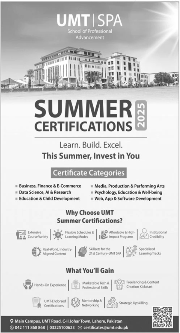 UMT Sialkot has announced admissions 2025 for BS. Eligible students can apply for academic admissions 2025 in UMT Sialkot Lahore Punjab Pakistan for Science University. Students for admissions in & criteria can apply as per Government institute admission policy 2025 before closing date as per advertisement. Read newspaper ad for exact details.