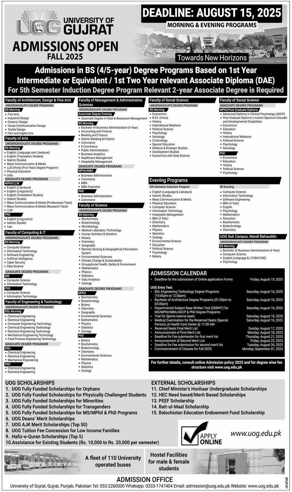University of Gujrat UOG bs admissions 2025 has been started. Eligible students who qualify as per admission criteria in University of Gujrat UOG Gujranwala Gujrat Punjab Pakistan can apply in Science University for academic year 2025. Students for admissions in & criteria can apply as per Government institute admission policy 2025 before closing date as per advertisement. Read newspaper ad for exact details.