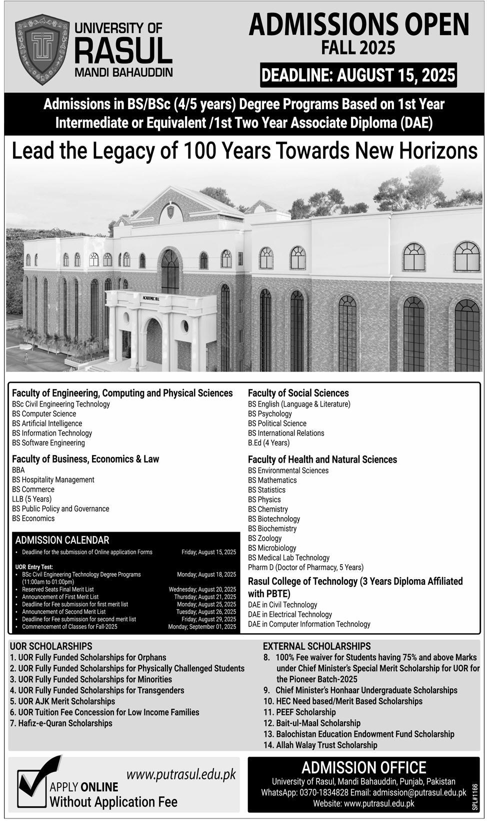 Admissions in Punjab University of Technology Rasul 2025 for bs has been announced. Eligible students who qualify as per admission criteria in Punjab University of Technology Rasul Mandi Bahauddin Punjab Pakistan can apply in Science University for academic year 2025. Students for admissions in & criteria can apply as per Government institute admission policy 2025 before closing date as per advertisement. Read newspaper ad for exact details.