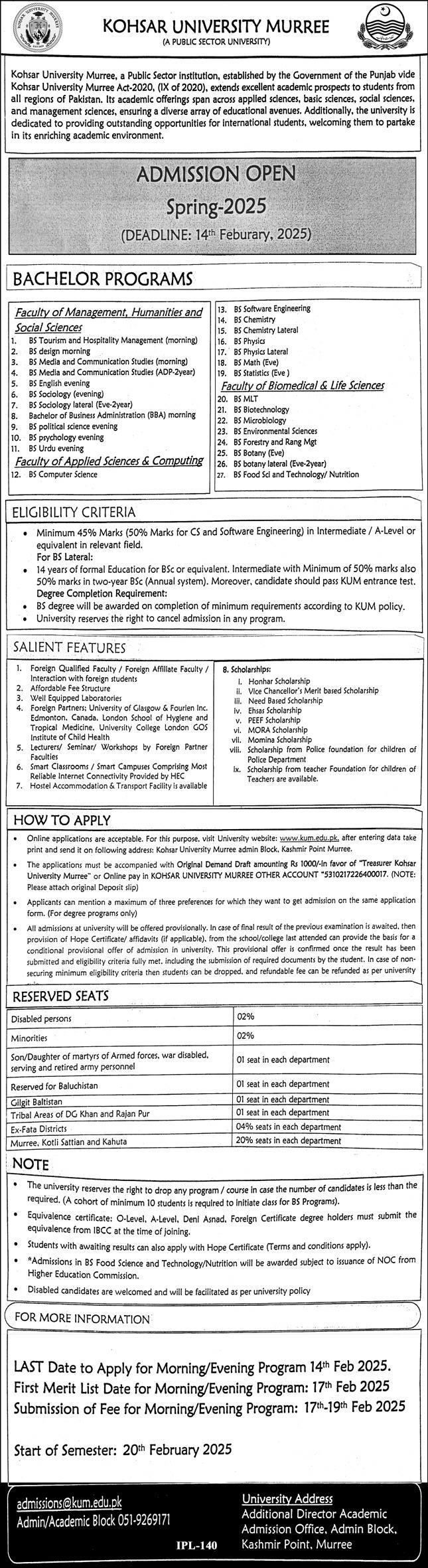 Kohsar University BS admissions admissions 2025 has been started. Eligible students who qualify as per admission criteria in Kohsar University Multan Murree Punjab Pakistan can apply in Science University for academic year 2025. Students for admissions in & criteria can apply as per Government institute admission policy 2025 before closing date as per advertisement. Read newspaper ad for exact details.