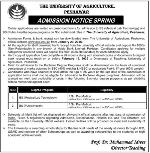 The University Of Agriculture Peshawar bs admissions 2025 has been started. Students who want to take admissions in The University Of Agriculture Peshawar Peshawar Khyber Pakhtunkhwa KPK Pakistan for academic year 2025 to continue education in Science University can apply. Students for admissions in can apply for online or campus classes as per Government institute criteria till admission closing date. Read newspaper ad for exact details.