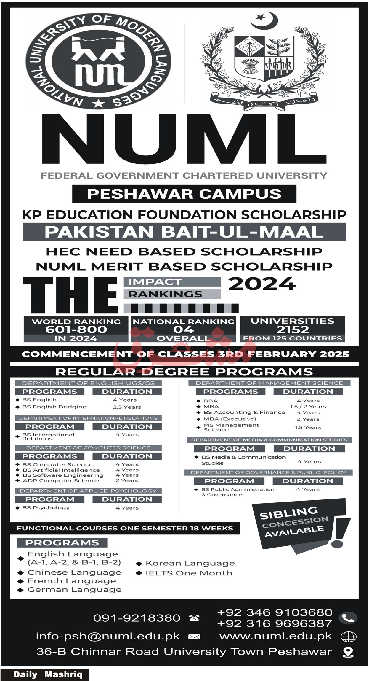 National University of Modern Languages NUML has announced admissions 2024 for BS, ADP, BBA, MBA, MS. Students who want to take admissions in National University of Modern Languages NUML Peshawar Khyber Pakhtunkhwa KPK Pakistan for academic year 2024 to continue education in Language University can apply. Students who want to enroll for academic session 2024 in BBA, MBA, ADP, MS and BS qualification and admission criteria for Government institute can apply till last date. Read newspaper ad for exact details.