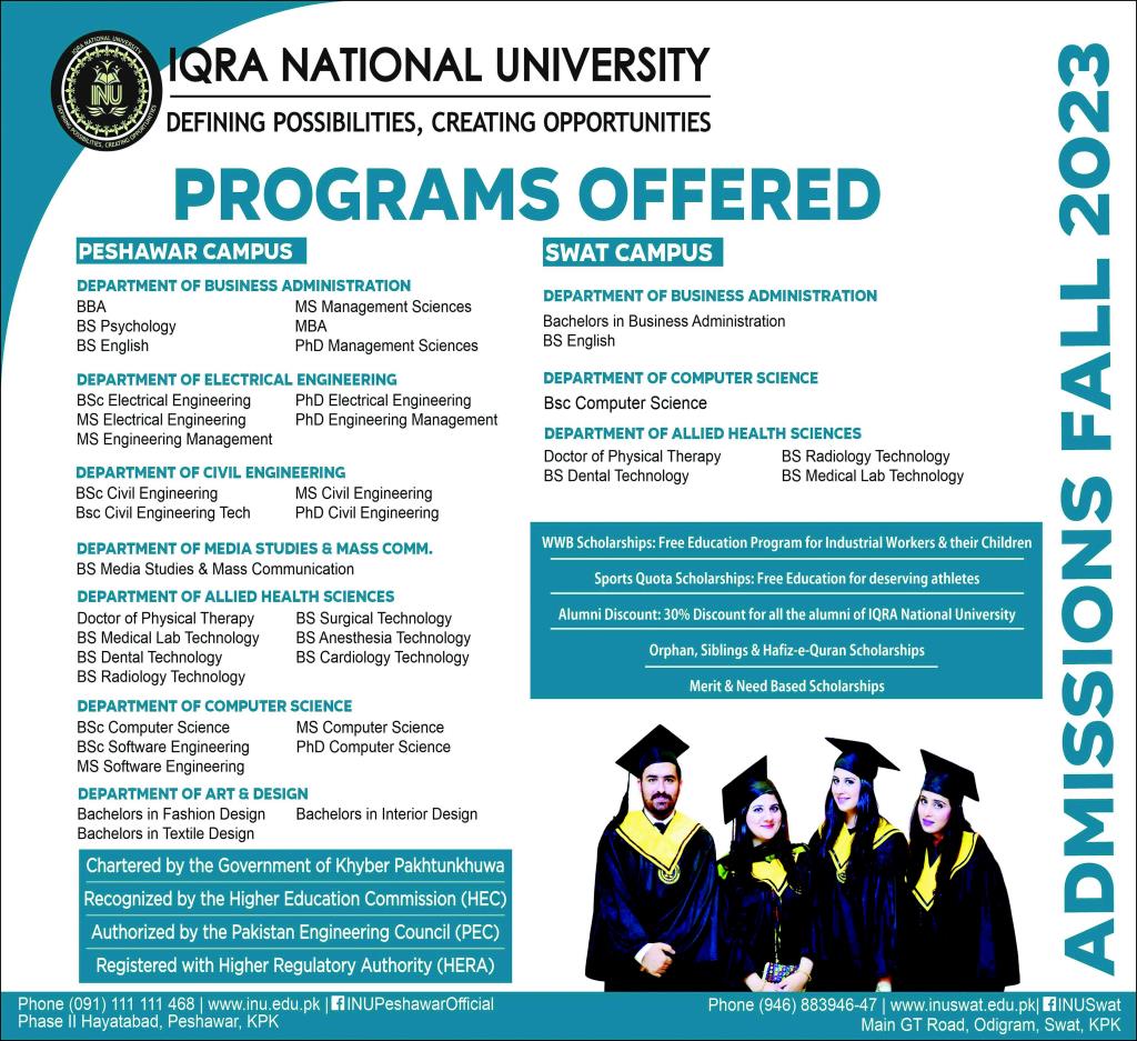 Iqra National University Bachelor Program, Doctor of Physical Therapy DPT admissions 2023 has been started. Eligible students who qualify as per admission criteria in Iqra National University Peshawar Swat Khyber Pakhtunkhwa KPK Pakistan can apply in Science University for academic year 2023. Students for admissions in DPT, BBA, BS, BCS and Bachelor can apply for online or campus classes as per Private institute criteria till admission closing date September 2, 2023. Read newspaper ad for exact details.