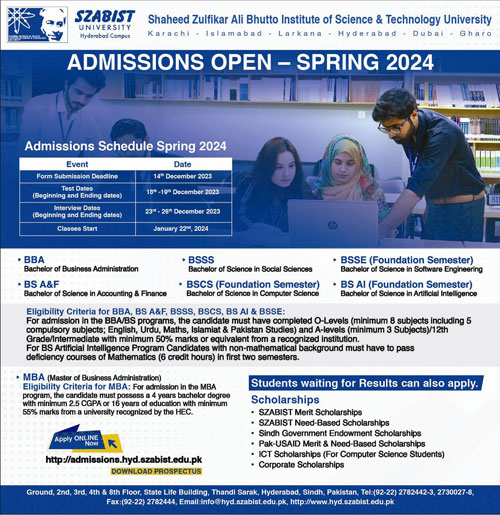 Admissions in Shaheed Zulfikar Ali Bhutto Institute of Science and Technology 2023 for BBA, BSSS, BSSE, BS A&F, BSCS, MBA has been announced. Shaheed Zulfikar Ali Bhutto Institute of Science and Technology Hyderabad Sindh Pakistan welcomes students to apply for admissions in academic year 2023 in Science University. Students who want to enroll for academic session 2023 in BBA, BS, BCS and MBA qualification and admission criteria for Government institute can apply till last date 14 December 2023. Read newspaper ad for exact details.