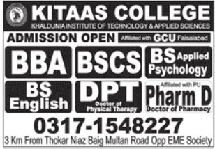 Admissions in Kitaas College 2022 for BBA, BSCS, BS English, Doctor of Pharmacy DPT, BS Applied Psychology, Doctor of Pharmacy has been announced. Students can enroll for admissions in Kitaas College Lahore Punjab Pakistan for academic year 2022 to continue campus based or online education in Science College. Eligible candidates for admissions in BS, BBA, Pharm D, DPT and BCS can apply as per Private institute criteria and before closing date 17 February 2022 after reading advertisement online. Read newspaper ad for exact details.