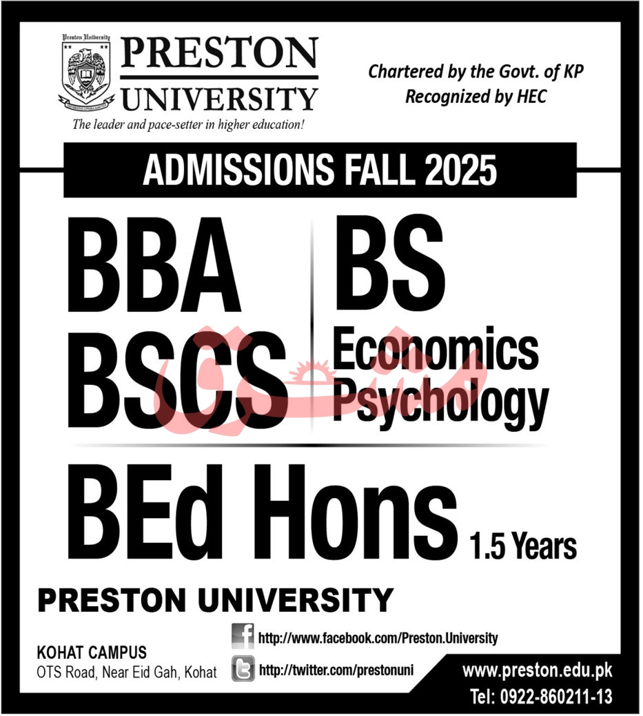 Preston University bs admissions 2025 has been started. Students can enroll for admissions in Preston University Kohat Khyber Pakhtunkhwa KPK Pakistan for academic year 2025 to continue campus based or online education in Science University. Eligible students for fulfilling criteria for admissions in can enroll as per Government admission policy 2025 till closing date. Read newspaper ad for exact details.