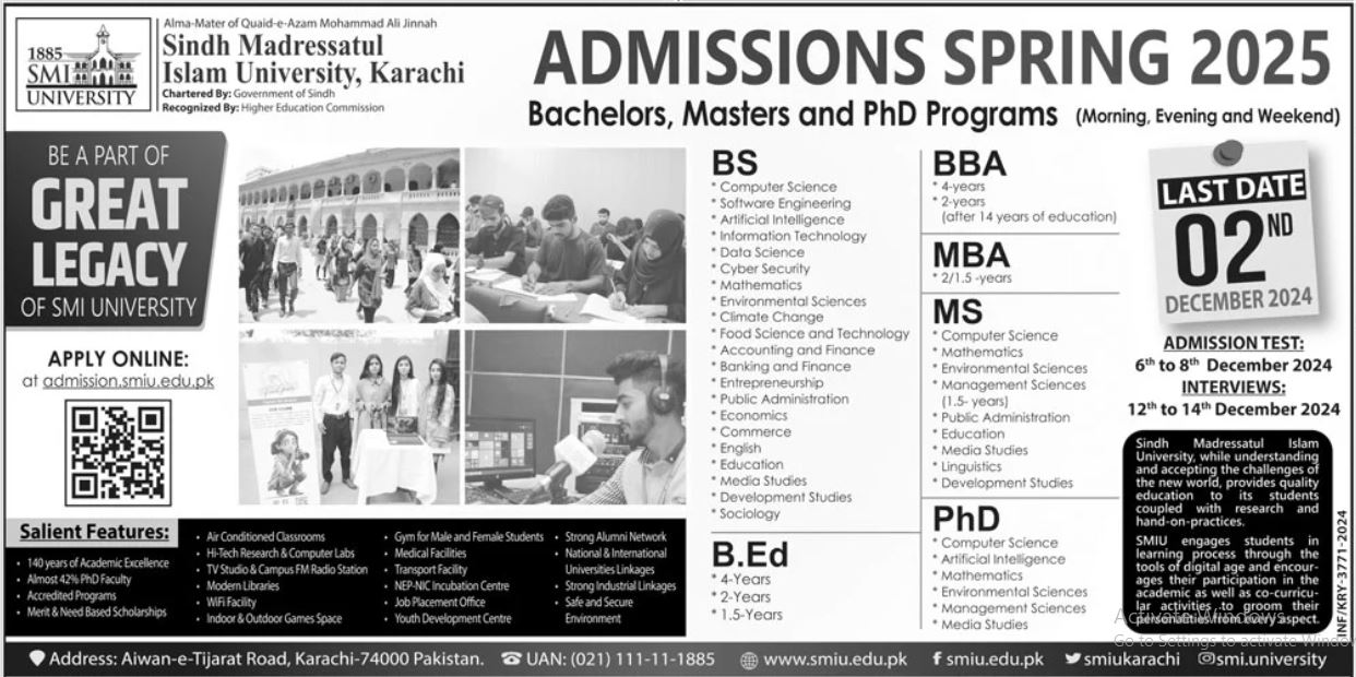 Sindh Madressatul Islam University BS, B.Ed, BBA, MS, MBA, PhD admissions 2024 has been announced. Eligible students who qualify as per admission criteria in Sindh Madressatul Islam University Karachi Sindh Pakistan can apply in Science University for academic year 2024. Students for admissions in Bachelor, Phd, BS, Master, MS, B.ed, BBA and MBA & criteria can apply as per Government institute admission policy 2024 before closing date December 2, 2024 as per advertisement. Read newspaper ad for exact details.
