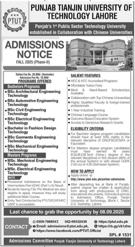Punjab Tianjin University of Technology PTUT bs admissions 2025 has been announced. Students who want to take admissions in Punjab Tianjin University of Technology PTUT Lahore Punjab Pakistan for academic year 2025 to continue education in Science University can apply. Students for admissions in & criteria can apply as per Government institute admission policy 2025 before closing date as per advertisement. Read newspaper ad for exact details.