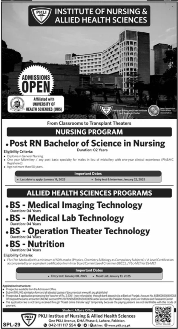 Allied Institute Of Nursing & Health Sciences bs bsn admissions 2025 has been started. Allied Institute Of Nursing & Health Sciences Lahore Islamabad Pakistan welcomes students to apply for admissions in academic year 2025 in Science College. Students for admissions in can apply for online or campus classes as per Private institute criteria till admission closing date. Read newspaper ad for exact details.