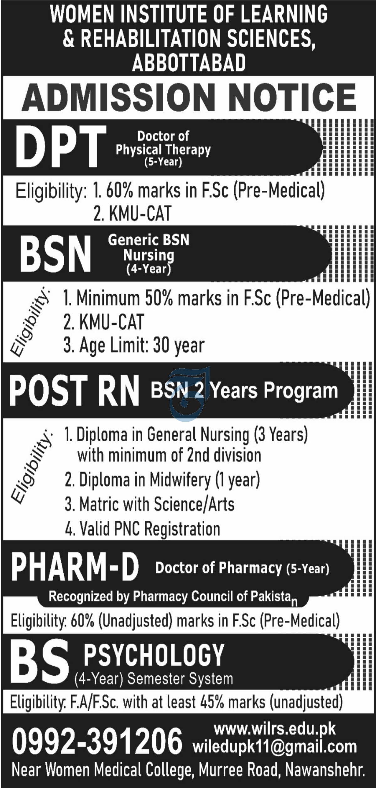 Admissions in Women Institute of Learning & Rehabilitation Sciences 2023 for BS Psychology, BSN Nursing, Pharm D, DPT has been announced. Eligible students who qualify as per admission criteria in Women Institute of Learning & Rehabilitation Sciences Abbottabad Khyber Pakhtunkhwa KPK Pakistan can apply in Medical University for academic year 2023. Eligible candidates for admissions in Pharm D, BSN, DPT and BS can apply as per Private institute criteria and before closing date 8 November 2023 after reading advertisement online. Read newspaper ad for exact details.