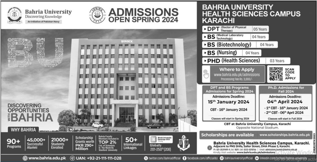 Bahria University admissions 2024 for BS, DPT, PhD has been announced. Students can enroll for admissions in Bahria University Karachi Sindh Pakistan for academic year 2024 to continue campus based or online education in Medical University. Students who want to enroll for academic session 2024 in Phd, DPT and BS qualification and admission criteria for Private institute can apply till last date 15 January 2024. Read newspaper ad for exact details.