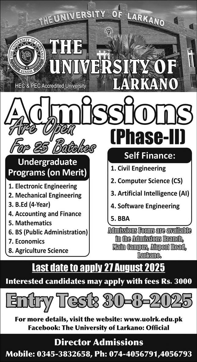 The University of Larkano bs admissions 2025 has been started. Students can enroll for admissions in The University of Larkano Larkana Sindh Pakistan for academic year 2025 to continue campus based or online education in Science University. Students for admissions in & criteria can apply as per Government institute admission policy 2025 before closing date as per advertisement. Read newspaper ad for exact details.