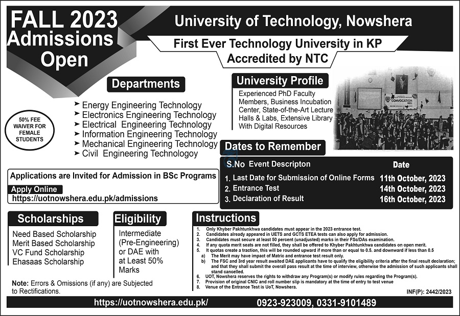 University of Technology has announced admissions 2023 for Bachelor of Engineering Programs. Students can enroll for admissions in University of Technology Nowshera Khyber Pakhtunkhwa KPK Pakistan for academic year 2023 to continue campus based or online education in Engineering University. Students who want to enroll for academic session 2023 in B.E and BS qualification and admission criteria for Government institute can apply till last date 11 October 2023. Read newspaper ad for exact details.