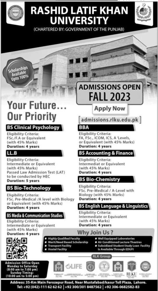 Rashid Latif Khan University admissions 2023 for BS, LLB, BBA has been announced. Students who want to take admissions in Rashid Latif Khan University Lahore Punjab Pakistan for academic year 2023 to continue education in Science University can apply. Students for admissions in LLb, BBA and BS & criteria can apply as per Private institute admission policy 2023 before closing date October 17, 2023 as per advertisement. Read newspaper ad for exact details.