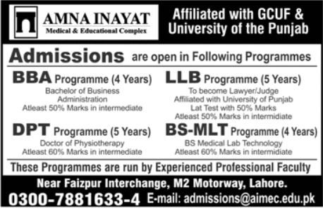 BS, LLB, BBA and DPT admissions at Amna Inayat Medical and Educational Complex