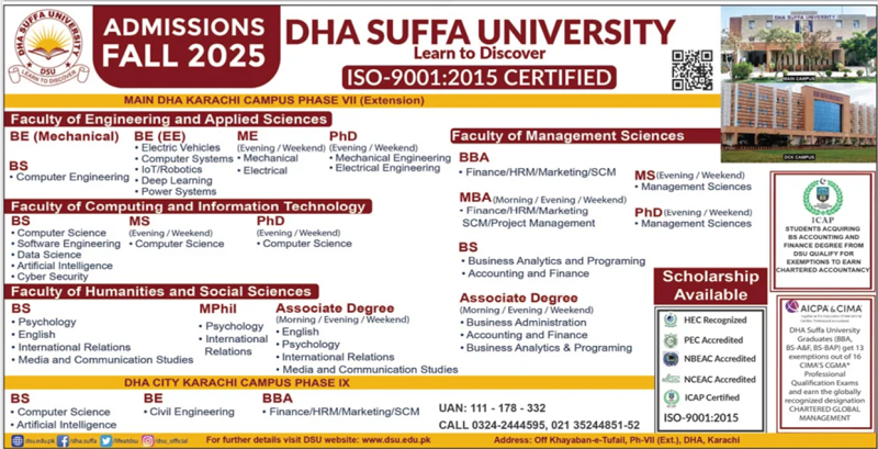 DHA Suffa University admissions 2025 for BS, MPHIL, PHD has been announced. DHA Suffa University Karachi Sindh Pakistan welcomes students to apply for admissions in academic year 2025 in Science University. Eligible candidates for admissions in can apply as per Private institute criteria and before closing date after reading advertisement online. Read newspaper ad for exact details.