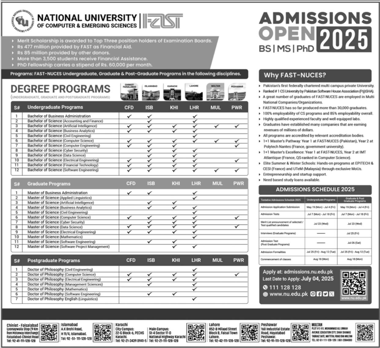 National University of Computer & Emerging Sciences admissions 2025 for bs has been announced. Students can enroll for admissions in National University of Computer & Emerging Sciences Lahore Punjab Pakistan for academic year 2025 to continue campus based or online education in Engineering University. Eligible candidates for admissions in can apply as per Government institute criteria and before closing date after reading advertisement online. Read newspaper ad for exact details.