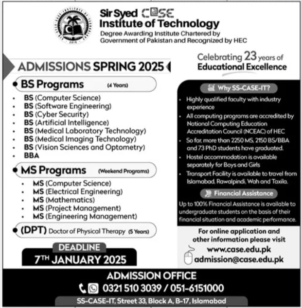 Sir Syed CASE Institute of Technology BS, MS, DPT admissions 2024 has been started. Students who want to take admissions in Sir Syed CASE Institute of Technology Islamabad Islamabad Pakistan for academic year 2024 to continue education in Science University can apply. Students for admissions in MS, DPT and BS can apply for online or campus classes as per Private institute criteria till admission closing date January 7, 2025. Read newspaper ad for exact details.