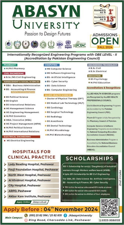 ABASYN University BS, MS, MPhil admissions 2024 has been announced. Eligible students can apply for academic admissions 2024 in ABASYN University Peshawar Khyber Pakhtunkhwa KPK Pakistan for Science University. Students who want to enroll for academic session 2024 in Mphil, BS and MS qualification and admission criteria for Private institute can apply till last date 5 November 2024. Read newspaper ad for exact details.