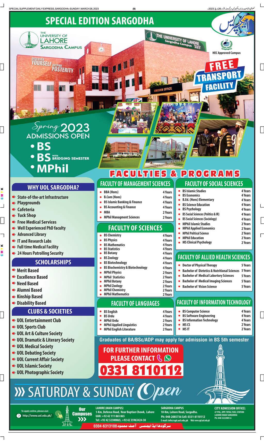The University of Lahore has announced admissions 2023 for BBA, B.Com, BS, BSCS, MS, MBA, MSCS, MSIT, DPT, MPhil. Eligible students who qualify as per admission criteria in The University of Lahore Sargodha Punjab Pakistan can apply in Science University for academic year 2023. Students who want to enroll for academic session 2023 in Mphil, MS, BS, BIT, MCS, BCS, MBA, B.com, BBA and DPT qualification and admission criteria for Government institute can apply till last date 26 April 2023. Read newspaper ad for exact details.
