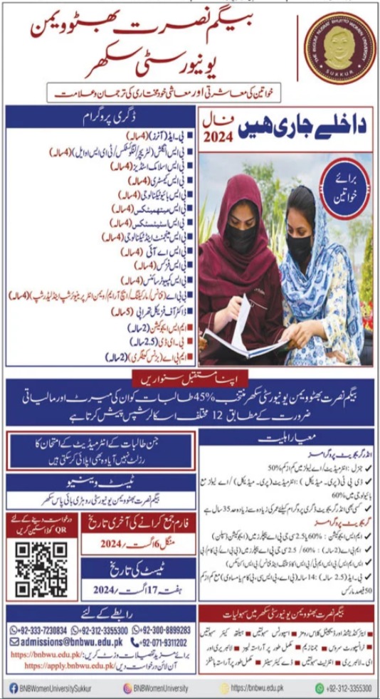 Begum Nusrat Bhutto Women University BS, MS, PhD admissions 2024 has been announced. Eligible students can apply for academic admissions 2024 in Begum Nusrat Bhutto Women University Sukkur Sindh Pakistan for Science University. Students for admissions in Phd, MS and BS & criteria can apply as per Government institute admission policy 2024 before closing date August 6, 2024 as per advertisement. Read newspaper ad for exact details.