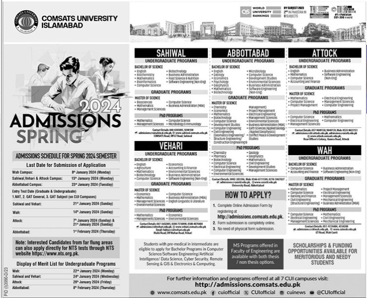 Comsats University BS, MS, PhD admissions 2024 has been announced. Eligible students can apply for academic admissions 2024 in Comsats University Islamabad Wah Cantt, Vehari, Abbottabad, Sahiwal, Attock and Islamabad Pakistan for Science University. Students who want to enroll for academic session 2024 in Bachelor, MS and Phd qualification and admission criteria for Government institute can apply till last date 15 January 2024. Read newspaper ad for exact details.