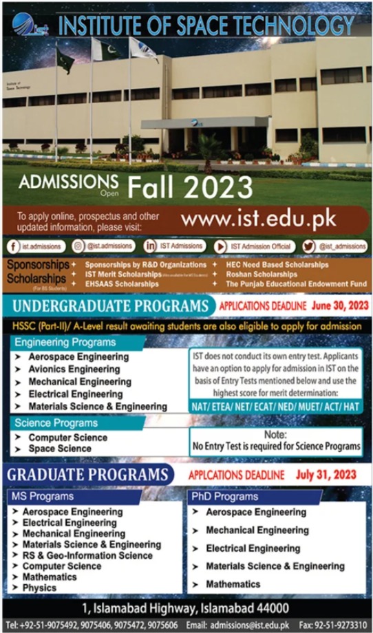 Institute of Space Technology IST Bachelor Program, Master Program, PhD Program admissions 2023 has been announced. Eligible students who qualify as per admission criteria in Institute of Space Technology IST Islamabad Islamabad Pakistan can apply in Science University for academic year 2023. Eligible students for fulfilling criteria for admissions in BS, MS, B.E, Master, Phd and Bachelor can enroll as per Private admission policy 2023 till closing date 31 July 2023. Read newspaper ad for exact details.