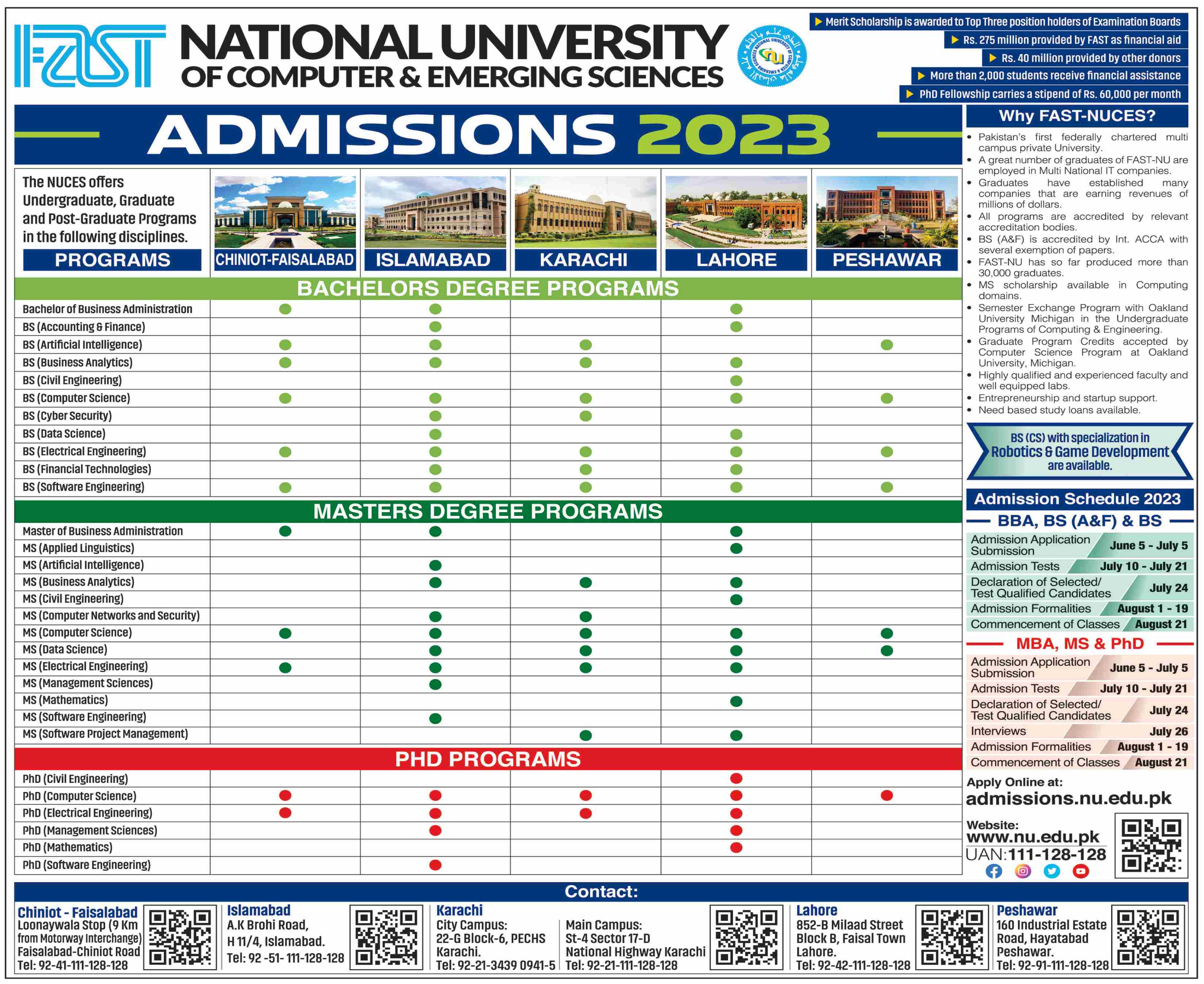 Admissions in National University of Computer & Emerging Sciences 2023 for Bachelor Programs, Master Programs, PhD Program has been announced. Eligible students who qualify as per admission criteria in National University of Computer & Emerging Sciences Islamabad Peshawar, Karachi, , Chiniot, Faisalabad and Lahore Islamabad Pakistan can apply in Science University for academic year 2023. Students for admissions in Bachelor, Phd and Master can apply for online or campus classes as per Private institute criteria till admission closing date July 5, 2023. Read newspaper ad for exact details.