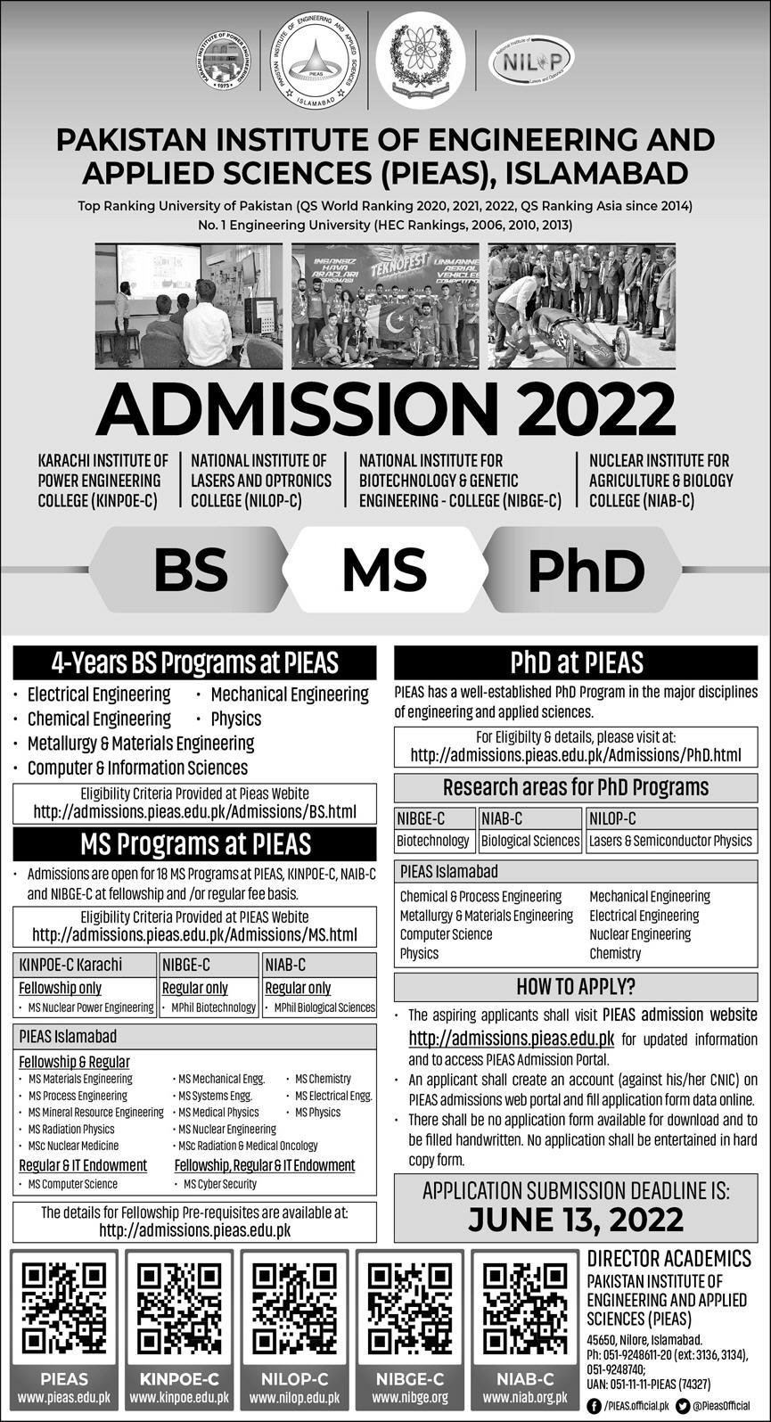 Pakistan Institute of Engineering & Applied Sciences PIEAS admissions 2022 for BS, MS, PhD has been announced. Eligible students who qualify as per admission criteria in Pakistan Institute of Engineering & Applied Sciences PIEAS Islamabad Islamabad Pakistan can apply in Science University for academic year 2022. Eligible students for fulfilling criteria for admissions in Phd, Bachelor and Master can enroll as per Government admission policy 2022 till closing date 13 June 2022. Read newspaper ad for exact details.