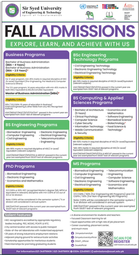 Sir Syed University of Engineering & Technology has announced admissions 2023 for BBA, MBA, BS, B.E, MS, PhD. Sir Syed University of Engineering & Technology Karachi Sindh Pakistan welcomes students to apply for admissions in academic year 2023 in Science University. Eligible students for fulfilling criteria for admissions in MS, B.E, BS, Bachelor, BBA and Phd can enroll as per Private admission policy 2023 till closing date 18 July 2023. Read newspaper ad for exact details.