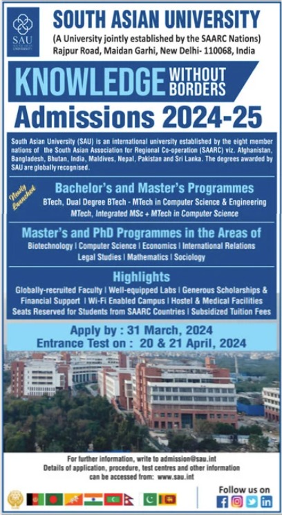 South Asian University SAU BS, MS, PhD admissions 2024 has been started. Eligible students who qualify as per admission criteria in South Asian University SAU Lahore Punjab Pakistan can apply in Science University for academic year 2024. Students for admissions in BS, MS and Phd & criteria can apply as per Private institute admission policy 2024 before closing date March 31, 2024 as per advertisement. Read newspaper ad for exact details.