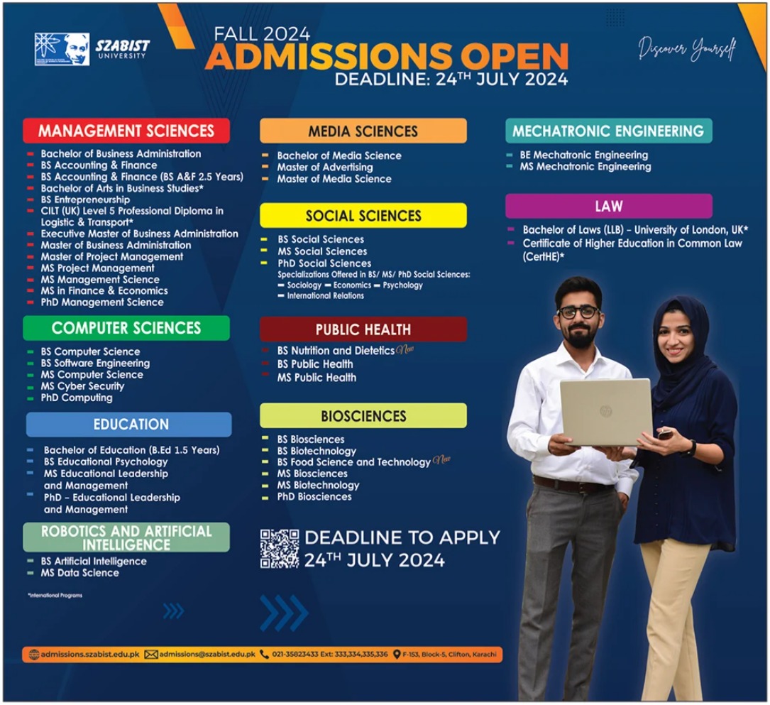 Shaheed Zulfiqar Ali Bhutto Institute of Technology SZABIST has announced admissions 2024 for BS, MS, PhD. Shaheed Zulfiqar Ali Bhutto Institute of Technology SZABIST Karachi Sindh Pakistan welcomes students to apply for admissions in academic year 2024 in Science University. Students who want to enroll for academic session 2024 in MS, Phd and BS qualification and admission criteria for Private institute can apply till last date 24 July 2024. Read newspaper ad for exact details.
