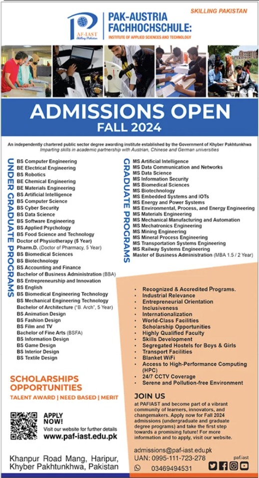 Pak Austria Fachhochschule Institute of Applied Sciences & Technology BS, MS, DPT, Pharm D, PhD admissions 2024 has been started. Pak Austria Fachhochschule Institute of Applied Sciences & Technology Haripur Khyber Pakhtunkhwa KPK Pakistan welcomes students to apply for admissions in academic year 2024 in Science University. Eligible candidates for admissions in Phd, BS, Pharm D, MS and DPT can apply as per Private institute criteria and before closing date 22 July 2024 after reading advertisement online. Read newspaper ad for exact details.